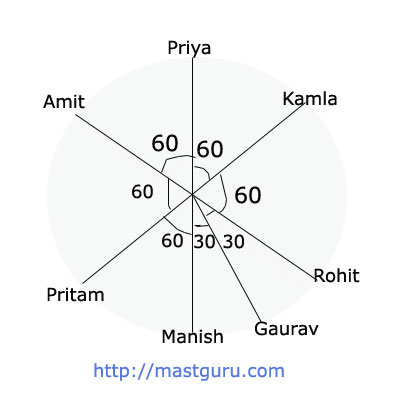 Rohit is sitting after two places right of Pritam, who is sitting one place right of Amit. Kamal forms an angle of 90 degrees from Gaurav and an angle of 120 degrees from Manish. Manish is just opposite Priya and is sitting on the left of Gaurav.