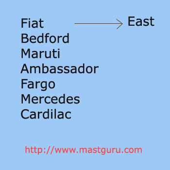 In an Exhibition seven cars of different companies - Cadillac, Ambassador, Fiat, Maruti, Mercedes, Bedford and Fargo are standing facing to east in the following order :